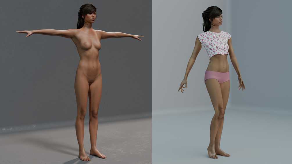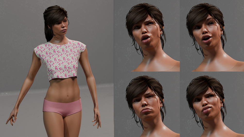 Model with hair, SSS Skin for the face, body rig and animation, 46 Face shape keys for animation and posing.